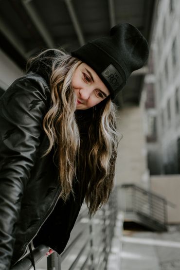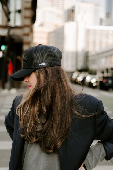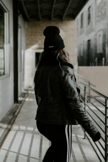 Merino wool beanies with leather logo patch. Embroidered ‘DANCE’ on back.